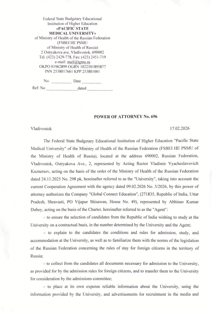 Global Connect Education is officially authorized to represent Pacific State Medical University. We bring you direct access to their programs and authentic guidance for your admission journey.